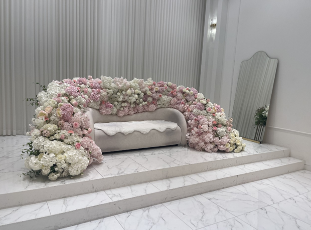 웨딩홀을 다니면서 제일 감탄했던 곳이 여기 메인 신부대기실이었습니다. 보는 순간 감탄이 나올 정도로 화려했습니다. 가장 시선을 사로잡는 것은 신부가 앉아서 대기하게 될 소파를 감싸듯이 풍성하게 장식된 파스텔 톤의 생화와 천장에서 폭포처럼 쏟아지는 플라워 드롭 장식이에요. 화이트 톤의 깔끔한 인테리어에 화사한 꽃들이 더해져 저의 짝꿍의 모습을 동화 속 주인공처럼 만들어 줄 것 같습니다 하하. 대기실 내부 바닥은 대리석으로 되어있고, 친구들이 같이 앉아서 쉴 수 있는 공간 또한 넓다 보니 오랜 시간 대기로 지칠 수 있는 신부와 그 친구들의 컨디션을 조금이나마 확보해주지 않을까 싶습니다.