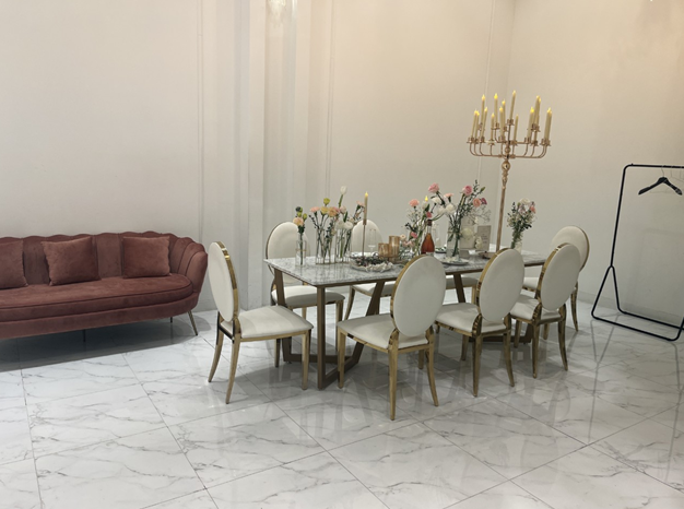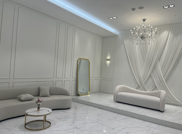 이 곳 역시 메인공간 못지않게 화이트 톤의 대리석 바닥과 웨인스코팅 벽면으로 화사하면서도 세련된 분위기를 만들어냅니다. 메인 대기실과 마찬가지로 공간이 여유로워 북적이지 않고 편안하게 머물 수 있다는 부분이 큰 장점인 것 같습니다. 신부가 앉아 있는 소파 옆으로 전신거울이 비치되어있어 마지막까지 매무새를 체크하기 좋을 것 같습니다. 물론 헬퍼분이 있어서 잘 조정해주시겠지만요!