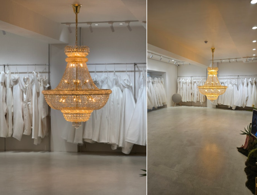 샵 내부에 들어가자마자 드레스 수량이 눈에 띄었다. 다양한 소재와 디자인이 한눈에 들어왔고, 상담 후 바로 피팅이 진행됐다. 인상 깊었던 부분은 피팅 단상이 높지 않았다는 점인데, 실제 예식장에서 신발을 신었을 때와 비슷한 비율을 보도록 배려한 구조라고 설명해주셨다.