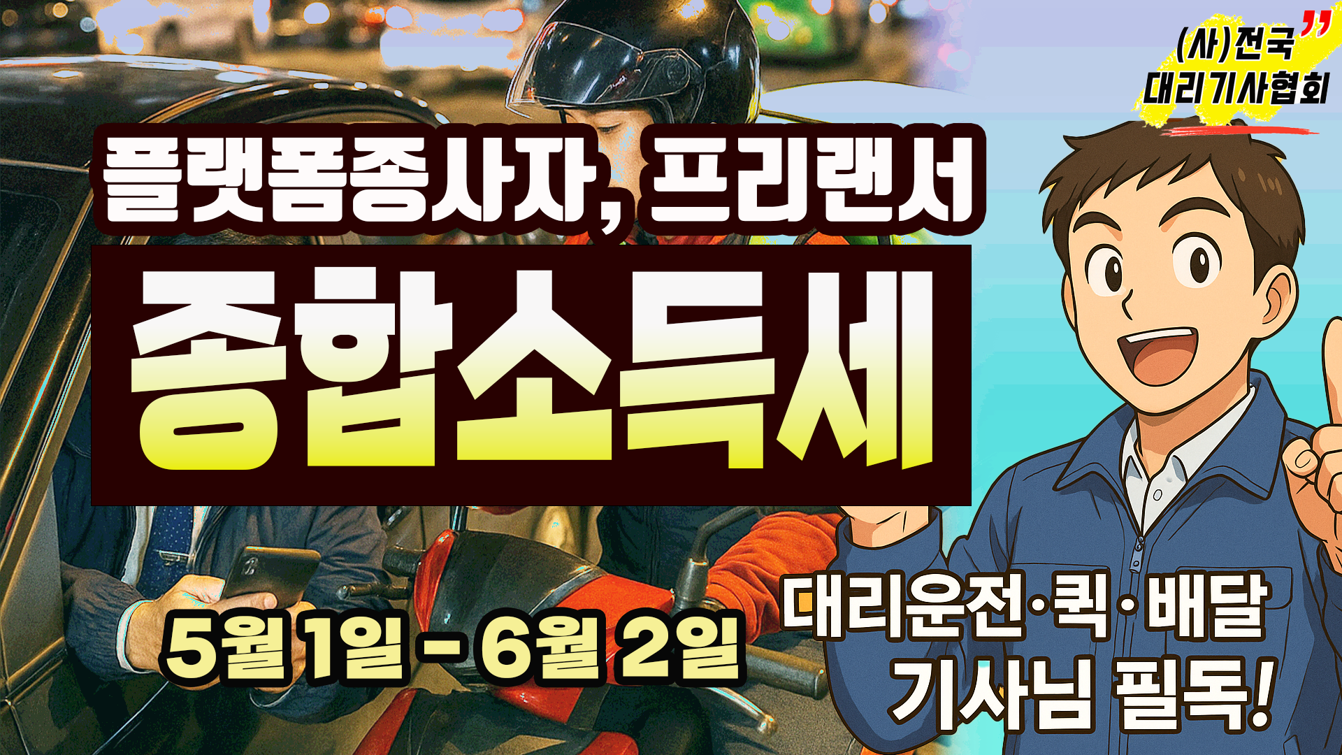 안녕하세요, (사)전국대리기사협회입니다. 올해도 종합소득세와 개인지방소득세 신고 및 납부 기간이 돌아왔습니다.