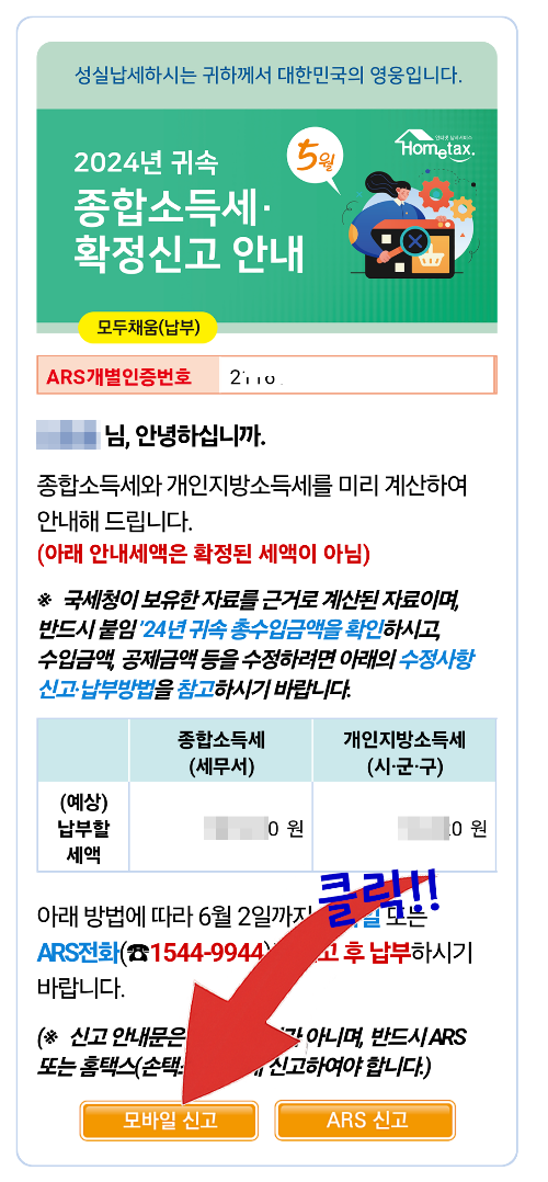 폰으로 발송된 안내 이미지 하단의 <모바일신고>를 클릭하셔서 손텍스(홈텍스 모바일버전)으로 이동, 거기에 나오는 모두채움서비스 안내화면을 따라 하시면 손쉽게 세금 신고가 완료됩니다. 또는 그 옆의 버튼을 클릭하셔서 ARS로 신고하셔도 됩니다.