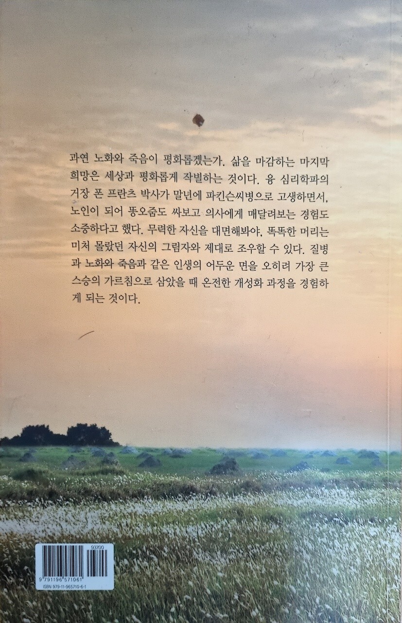 과연 노화와 죽음이 평화롭겠는가. 삶을 마감하는 마지막 희망은 세상과 평화롭게 작별하는 것이다. 융 심리학파의 거장 폰 프란츠 박사가 말년에 파킨슨씨병으로 고생하면서, 노인이 되어 똥오줌도 싸보고 의사에게 매달려 보는 경험도 소중하다고 했다. 무력한 자신을 대면해봐야, 똑똑한 머리는 미처 몰랐던 자신의 그림자와 제대로 조우할 수 있다. 질병과 노화와 죽음과 같은 인생의 어두운 면을 오히려 가장 큰 스승의 가르침으로 삼았을 때 온전한 개성화 과정을
