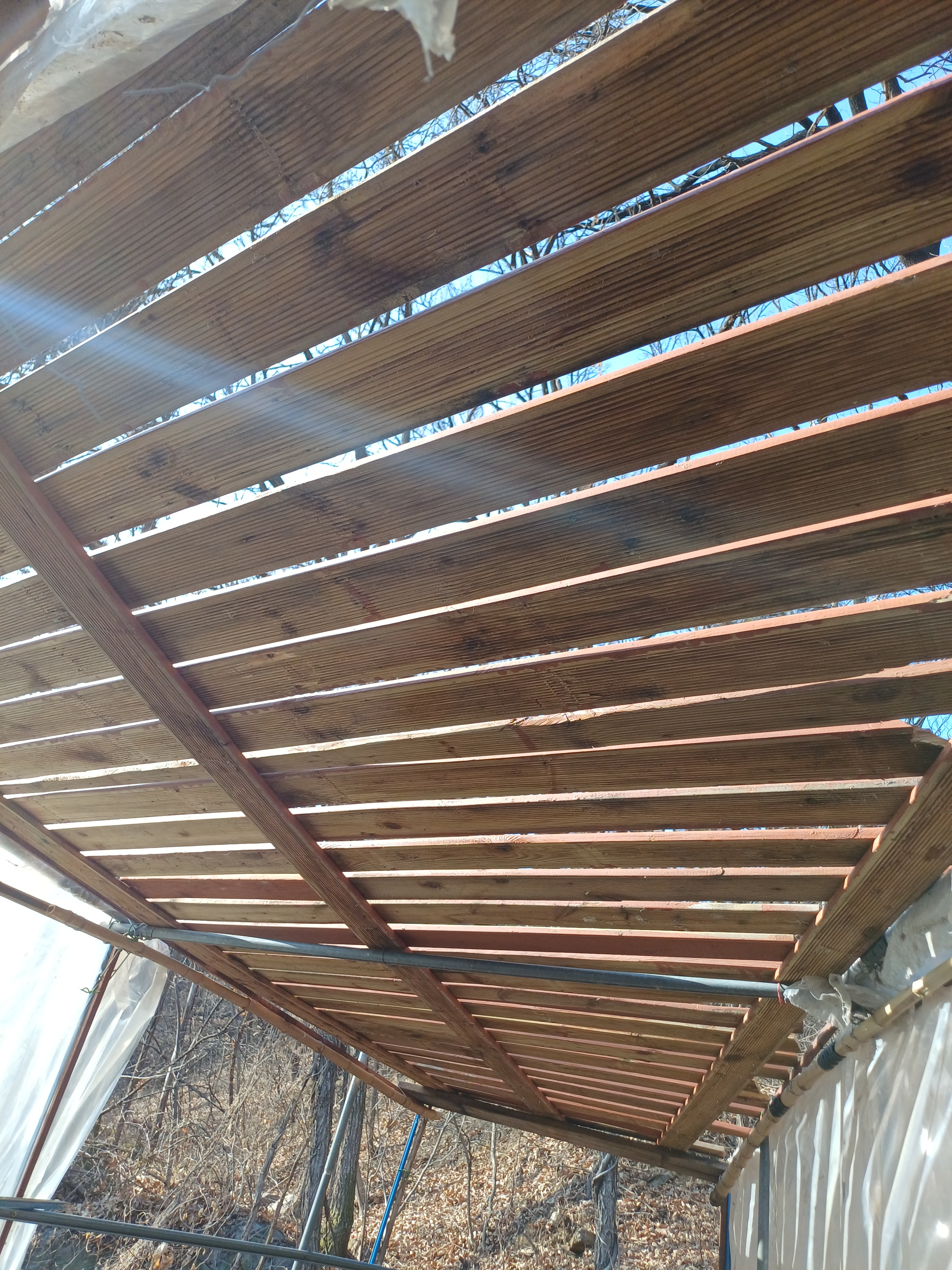 방부목으로 천장을 만들고, 비닐을 치고, 천만을 치고, 차광막을 덮고..
