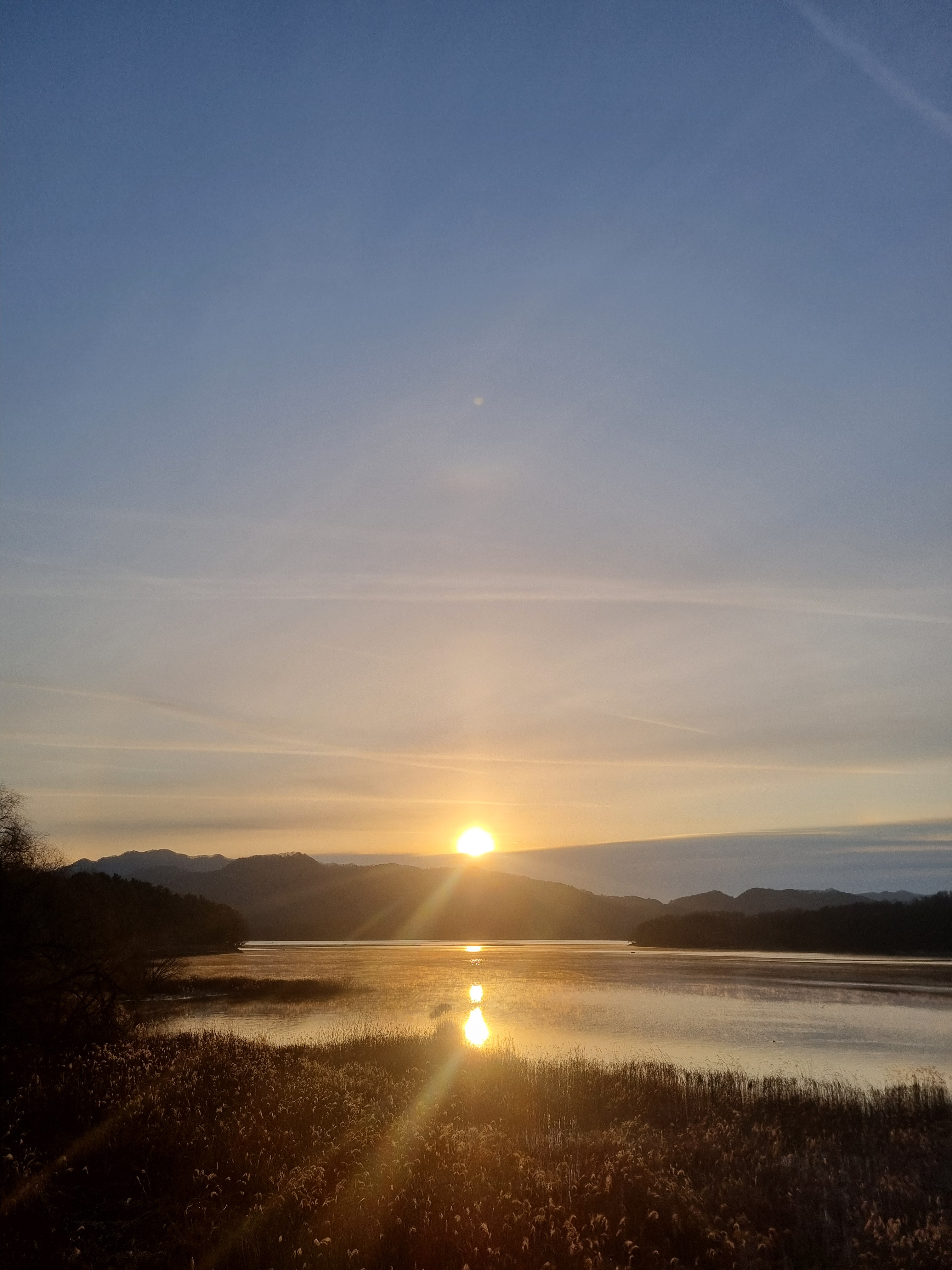 일출 예상시각이 7시42분인데 저희 대청호 건너편에 산이 있어 산 위로 해가 올라오려면 해돋이 시간이 예상시각보다는 20분가량 더 걸립니다.