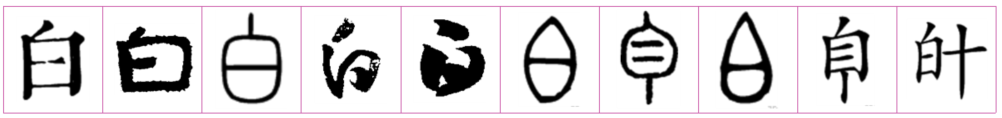 ① 『설문』에서 白은 “西方色이니, 음(陰)이 작용하여 물건의 색이 희다. 入(들 입)에 二가 합해졌으니, 二는 음수라(西方色也니 陰用事하여 物色白이라 从入合二니 二는 陰數라).”고 했다. 가을은 만물이 凋落(조락)하고 퇴색하여 희끄무레한 색으로 변한다. 사람이 늙으면 머리카락이 흰색으로 변하는 것도 같은 이치이다. 이에 白을 陰으로 들어가는 글자로 보았고, 위의 첫 번째 글자인 강희자전체에서는 白 안의 一을 음부호 (- -)로 썼음을 볼 수 있다.