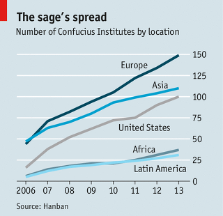 (사진설명 : 세계 각 지역의 공자문화원 숫자 : 2004년 서울에 처음 설립된 이래 전 세계 공자학원은 2014년 8월 기준으로 123개국 465곳에 달한다. 공자교실도 713곳에 이른다. |