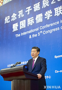 중국 베이징 인민대회당에서 '공자탄신 국제학술대회 및 국제유학연합회 제5차 총회'가 열린 가운데 시진핑(習近平) 국가주석이 연설하고 있다. 시 주석은 이날 중국 최고지도자로서는 최초로 공자 탄신을 기념하는 국제학술회에 참석해 유가 사상을 중요시하는 메시지를 전달했다.