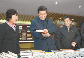 <사진설명 : 2013.11.26. 중국 시진핑 국가주석이 중국 최고 지도자로서는 20여 년 만에 산둥 성 취푸의 공자연구원을 방문해 관련 서적들을 살펴보고 있다.>