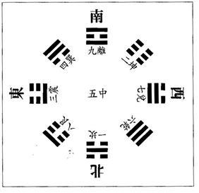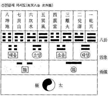 위와 같은 선천팔괘는 요임금 때의 갑진년 대홍수의 재난을 겪으며 禹에 의해 洛書九宮數理(낙서구궁수리)가 펼쳐지고, 井田法이 완성되었다. 또한 이 數의 원리에 의거하여 후천팔괘방위도가 세워지며, 文王과 周公과 孔子로 이어지는 『주역』의 철학이 완성되는데, 아래 그림을 통해서 그 원리를 살펴보기로 한다. 곧 『주역』은 인류의 가장 오랜 문헌이면서 황하문명권의 세계관을 가장 잘 집약하고 있는데 그 핵심사상이 음양오행이다.