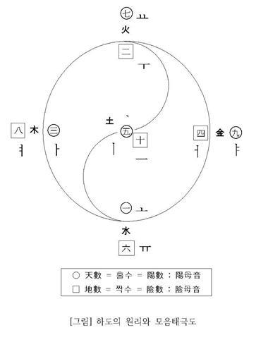 곧 사상위인 一二三四와 사상수인 六七八九가 각각 합하여 一六水, 二七火, 三八木, 四九金, 五十土를 낳는데, 가운데의 五는 천태극(天太極), 十은 지태극(地太極)이라 하고, 두 태극의 수가 합하여 인태극(人太極)을 이룬다. 이 원리를 그대로 담아낸 것이 「해례본」의 모음 제자(制字) 원리이다.