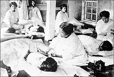 ▲ 일본식 통바지 ‘몸빼’를 입고 환자를 돌보는 간호부(간호사)들