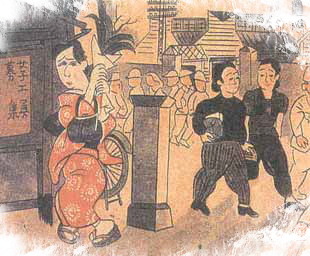 ▲[화려한 복식을 입은 여성이 몸빼를 입고 부지런히 근로하러 가는 여성을 보고 부끄러워한다는 내용의 1940년대의 포스터입니다.]