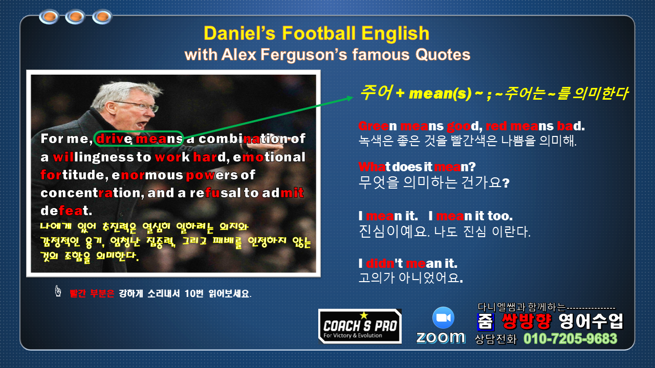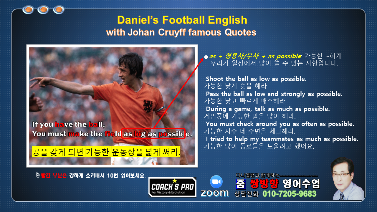1년 가까이 세계적인 명장들의 명언으로 축구의 지혜와 축구의 자세등을 영어로 가르쳐 왔고