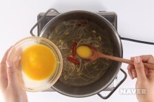03. 쌀뜨물에 콩나물과 홍 고추를 넣고 끓이다 팔팔 끓으면 계란 물을 한 숟가락씩 떠 넣습니다.