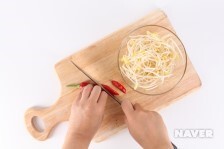 01. 콩나물은 다듬어 씻어 준비하고 홍 고추는 씨를 제거해 어슷하게 썹니다.