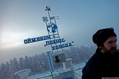 3. A visitor at "The Pole of Cold" marker in the village of Oymyakon.