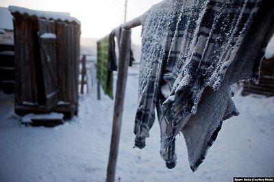 Tomtor is a small town situated inside the "Pole of the Cold", the world's coldest inhabited place, where the January's average temperature is -50 degrees centigrades. I visit the old gold mine where nice ice sculptures are kept, and an hot spring where most water never freezes.