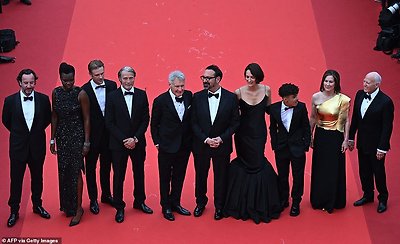 12. Star-studded: It wasn't long before she joined James Mangold, Harrison Ford and Mads Mikkelsen (L-R) for a group picture at the glitzy event. 스타급: 얼마 지나지 않아 그녀는 좌에서 우로 제임스 맨골드, 해리슨 포드, 매즈 미켈슨과 함께 화려한 행사에서 단체 사진을 찍었다.
