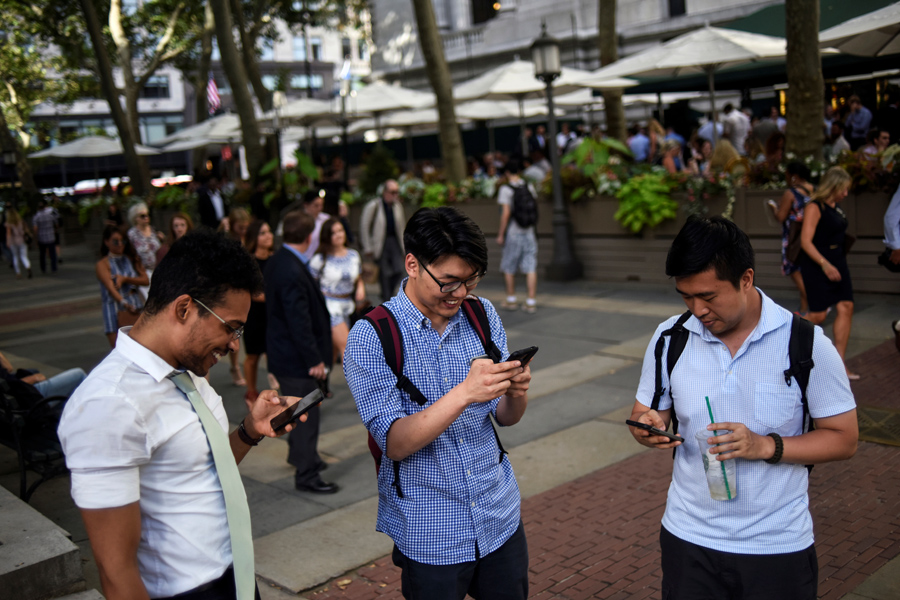 13. Medical students Jag Chilana, left, and Scott Kobner, center, play Pokémon Go on their smartphones at Union Square, July 11, 2016 in New York City. # 의과대학생 학생 잭 칠래나(左)와 스콧 코브너(中)가 뉴욕시티의 유니언 광장에서 2016년 7월 11일에 그들의 스마트 폰으로 포켓몬 고 게임을 한다.
