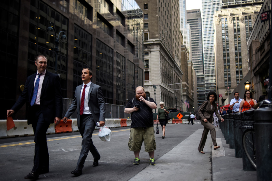 5. Jerimie Nason, center, plays the augmented reality mobile game Pokémon Go by Nintendo as people pass him on the street outside Grand Central Terminal in New York City, July 11, 2016. # 사람들이 2016년 7월 11일에 뉴욕시티, 그랜드 센트럴 터미늘 밖의 거리에서 그를 지나칠 때 제레미 내슨(中)이 닌텐도의 증강 현실 모바일 게임 포켓몬 고 게임을 한다.