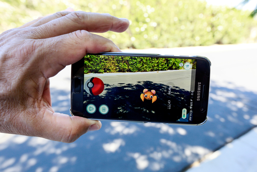6. The augmented reality mobile game Pokémon Go by Nintendo is shown on a smartphone screen in this photo taken in Palm Springs, California, July 11, 2016. # 닌텐도의 증강 현실 모바일 게임 포켓몬 고가 2016년 7월 11일에 캘리포니아州 팜스프링스에서 찍은 이 사진에서 스마트폰 화면으로 볼 수 있다.