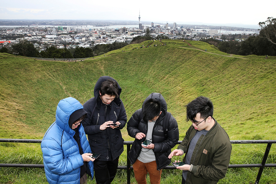 9. From left to right, Zijia Ge, Jack Zheng, Ky Pham, and Tony Sun search for Pokémon on the top of Mount Eden, July 13, 2016, in Auckland, New Zealand. # 좌에서 우로, 지지아 지, 잭 정, 키팸, 토니 선이 뉴질랜드, 오클랜드의 이든山 꼭대기에서 포켓몬을 검색한다.