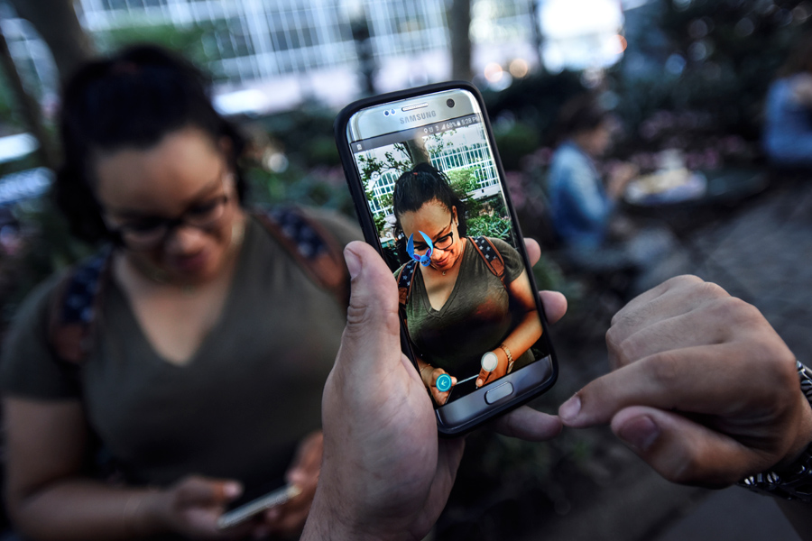 22. Theodore Belizaire plays the augmented reality mobile game Pokémon Go by Nintendo in Times Square, New York City, U.S. July 11, 2016. # 데어도어 벨리재어가 2016년 7월 11일에 뉴욕 시티의 타임 스퀘어에서 닌텐도의 증강 현실 모바일 게임 포켓몬 고 게임을 한다. |