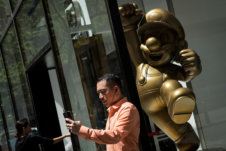 15. A man takes a selfie outside of Nintendo's flagship store, July 11, 2016, in New York City. # 한 남자가 뉴욕 시티에서 2016년 7월 11일에 니텐도 체인점 밖에서 셀피(셀카)를 찍는다.