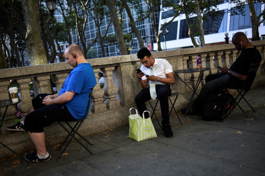 17. David Melendez, center, uses three phones as he plays the augmented reality mobile game Pokémon Go by Nintendo in New York City, July 11, 2016. # 데이비드 멜렌데스(中)가 2016년 7월 11일에 뉴욕 시티에서 그가 증강 현실 모바일 게임 포켓몬 고 게임할 때 3대의 휴대폰을 사용한다.