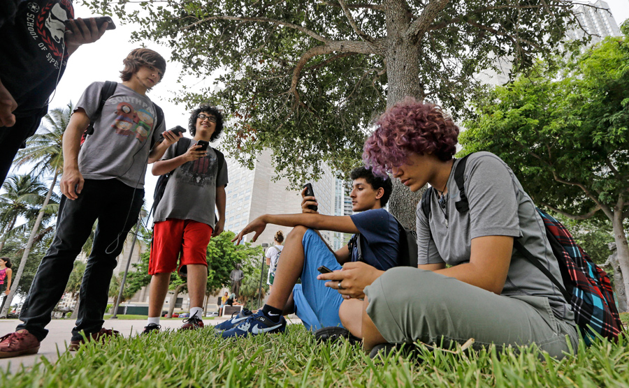 20. Pokemon Go players Ana Valentina Ojeda, right, and Jaeden Valdespino, second from right, check their smartphones as they look for Pokémon, July 12, 2016, at Bayfront Park in downtown Miami. # 포켓몬 고 게임하는 사람들, 아나 발렌티나 오예다(右), 제이든 발데드티노(右에서 두 번째)가 마이애미 시내 베이프런트 공원에서 2016년 7월 12일에 포켓몬을 검색하며 휴대폰을 확인한다.