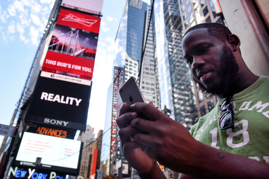 19. Theodore Belizaire plays the augmented reality mobile game Pokémon Go by Nintendo in Times Square, New York City, July 11, 2016. # 디어도어 벨리재어가 2016년 7 월 11일에 뉴욕 시티의 타임 스퀘어에서 닌텐도의 증강 현실 모바일 게임 포켓 몬스터 고 게임을 한다.