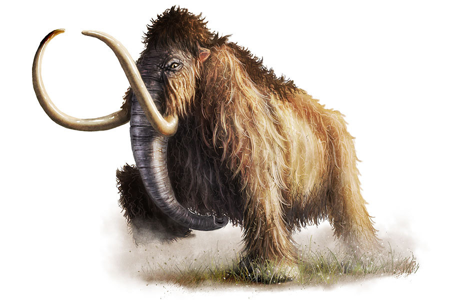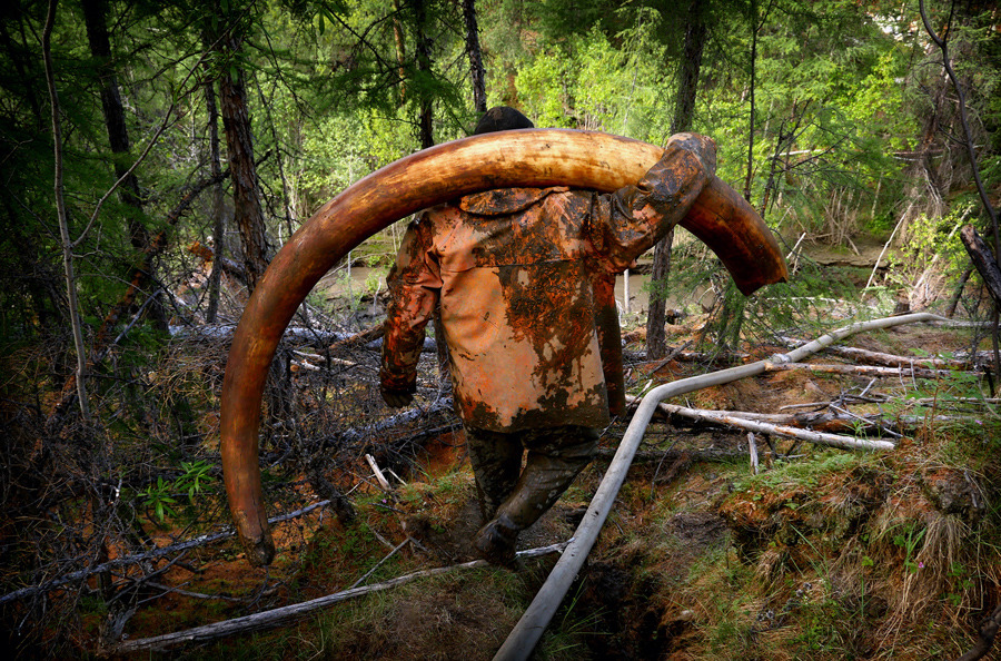 8. A tusker wipes mud from a mammoth tusk just discovered in a hillside. # 한 터스커가 산기슭에서 발견한 매머드 엄니(상아)에서 진흙을 닦는다.