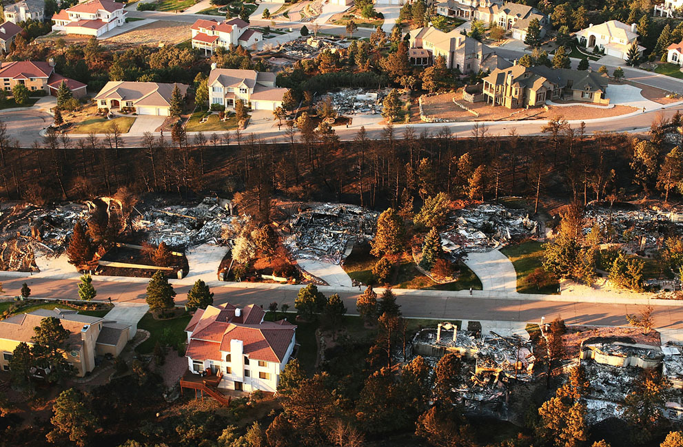 주택들이 2012년 6월 30일에 콜로라도州 콜로라도 스프링스지역에서 공중에서 본 왈도 캐년 화재에 의해 파괴되었다. 선선한 날씨와 가벼운 바람의 도움으로 완화된 대형 화재가 수백채의 주택을 파괴하고 3만5천명 이상을 대피하도록 강요했다.