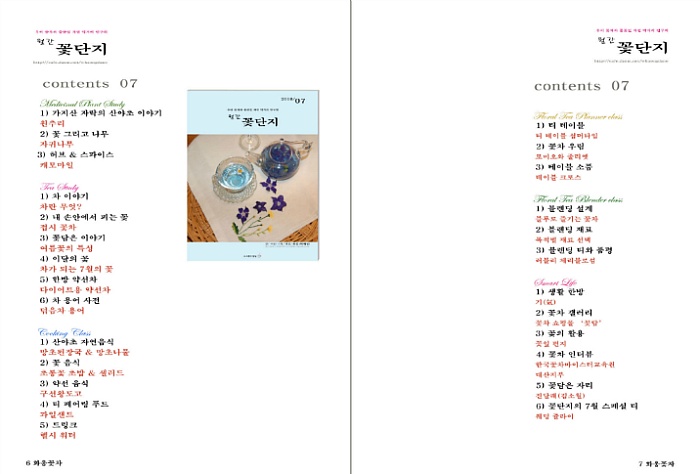 '월간 꽃담'이 꽃단지라는 이름으로 여러분들과 만납니다. 매월 발행되구요 꽃차, 꽃음식, 한방차, 약선음식, 약용식물, 블렌딩 허브, 차 용어, 티 테이블 세팅등 다양한 내용으로 구성되어 있어요. 서점에서 월간 꽃담을 찾으셨다는 분들 있으신데요 이 책은 판매용 책은 아니구요 한국꽃차마이스터교육원의 '풀꽃잎 연구회' 회원들에게 참고서 같은 역활을 하는 책 인데 월간지 형식으로 발행 되는 교재입니다. 무슨 교재를 매월 발행하냐구요? 우리 한국꽃차마이스터교육원은 그 만큼 풍부한 내용으로 차별화된 교육을 하고 있다고 생각하시면 되겠지요.~ㅎ 지역별로 지부가 움직이고 있구요 수강을 원하시면 지역에 가까운 지부에서 하시면 됩니다. 풀꽃잎 연구회 회원 가입은 누구나 가능합니다. 꽃차에 관심가지신 분들이 많은것 같아 한시적으로 누구나 회원 가입하실 수 있도록 문을 열어드립니다. 물론 회비 내셔야 하구요. 회원 되시면 '월간 꽃단지' 받아 보실수 있구요 화옹샘 직강으로 무료강좌 계절별로 4회 들으실수도 있어요. 풀꽃잎 연구회 회원 가입은 전화 상담 후 승인 해 드리니 아래 번호로 연락 주시면 됩니다. 010-5402-3135 화옹샘 (수업 중에는 통화 안되니 문자 남겨주세요) |