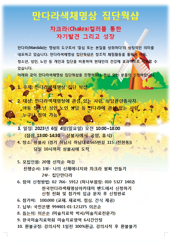 만다라색채명상워크샵 - 상불사 2023. 6. 4 작성자지니|작성시간23.07.08|조회수7 목록 댓글 0 글자크기 작게가 글자크기 크게가 5회 상불사 만다라색채명상워크샵 2023년 6월 4일 5회 상불사 만다라색채명상워크샵 2023년 6월 4일 다음검색 현재 게시글 추가 기능 열기 북마크 공유하기 신고 센터로 신고 댓글 댓글 0 댓글쓰기 답글쓰기 댓글 리스트