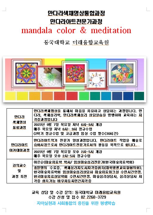 만다라색채명상통합과정 2학기 개강 작성자지니|작성시간23.08.13|조회수17 목록 댓글 0 글자크기 작게가 글자크기 크게가 만다라색채명상통합과정 만다라아트아카데미과 2022년 9월 7일 개강합니다. 다음검색 현재 게시글 추가 기능 열기 북마크 공유하기 신고 센터로 신고 댓글 댓글 0 댓글쓰기 답글쓰기 댓글 리스트