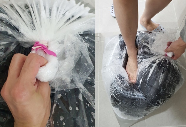 그다음 비닐을 밟아 패딩에 묵은 때를 속 시원하게 빼 줍니다.