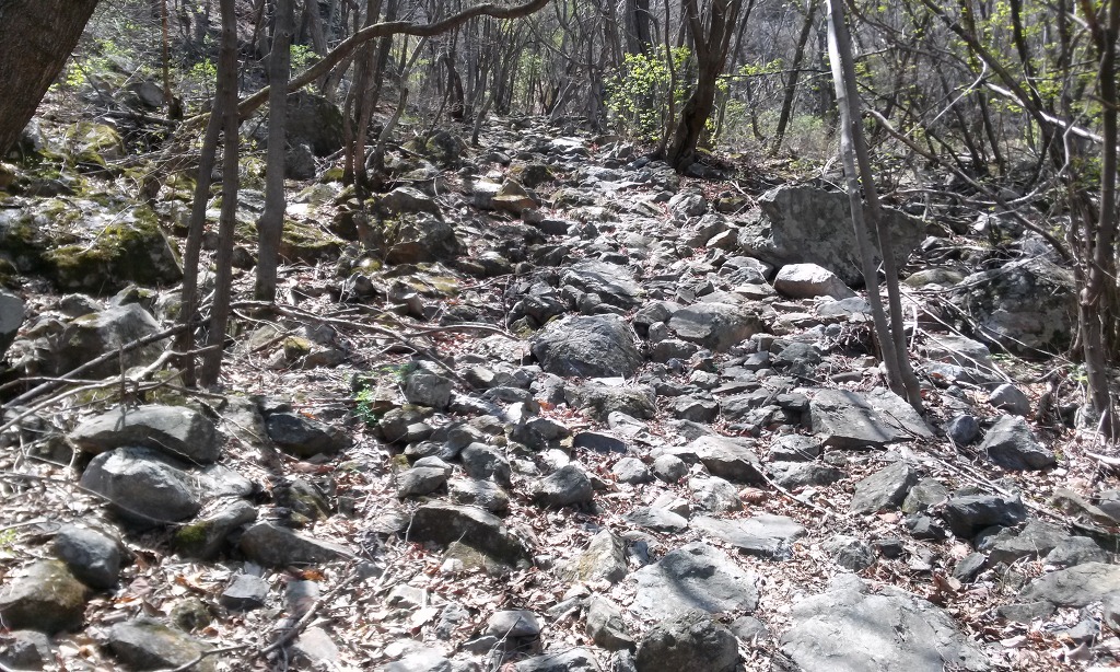 산의 특징: 1) 초반 오름길은 1시간 정도 된비알 너덜 길입니다.