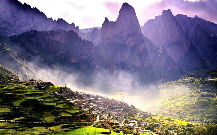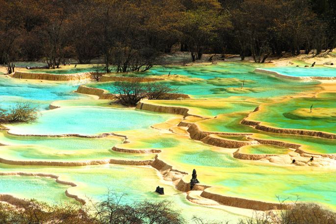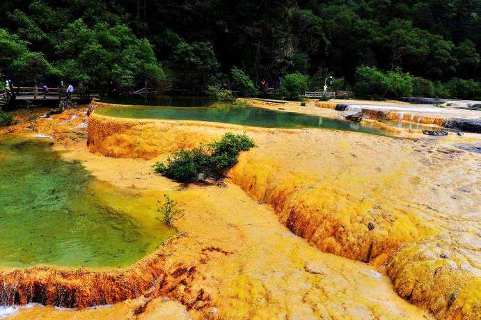 【황룡】 해발 3100m에서 3600m에 까지 계곡을 따라 군락을 이루고 있는 호수들이 마치 산간 다랑논에 연록색과 황금색 물을 담아 놓은 형상인데 그 중에서도 계곡 꼭대기에 위치한 오채지(五彩池)는 황룡 최고의 걸작입니다. 색창연한 황룡사(黃龍寺) 위쪽에 수 십 개의 크고 작은 계단형 연못이 타원형으로 군락을 이루고 있는데 얼핏 보면 하늘색이지만 주위를 둘러싼 산책로를 따라 걸으면 비취, 파랑 , 초록, 노랑, 보라 5개 색체가 투영됩니다. 황룡은 4km의 산책로를 따라 걸어야만 관광이 가능합니다.