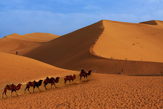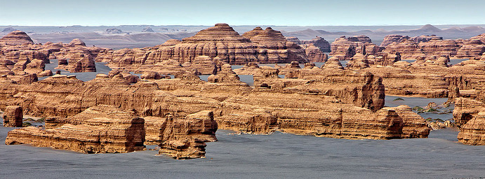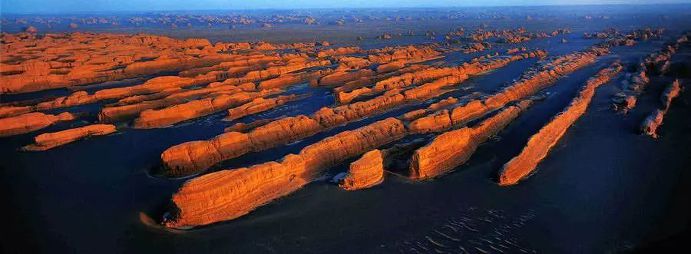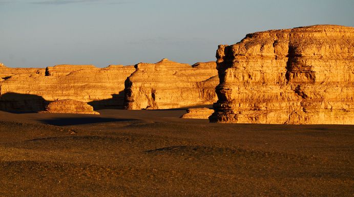 【야단 사막 지질공원】 둔황야단지형[敦煌牙丹地貌]은 동서간의 너비가 15㎞, 남북간의 폭이 2㎞로 중세시대의 성루형태를 하고 있으며, 궁전, 성벽, 거리, 큰 건물, 광장, 공작이나 독수리를 닮은 조각들로 조성되어 있다. 사막 일몰이 시계적으로 유명하여 많은 관광객들이 일몰을 보기위해 모여든다.