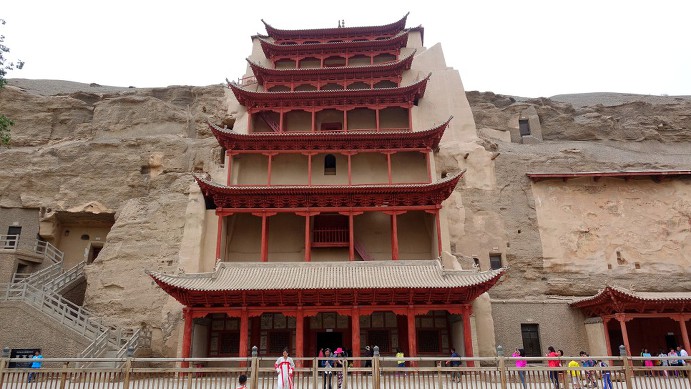 【막고굴】 현 감숙성 돈황시 동남쪽 25㎞ 명사산 동남쪽 단층 벼랑에 지역에 위치하고 있다. 전진(前秦) 건원(建元)2년(366) 승려인 낙준이 개착하기 시작하였다고 전한다. 현재 보존된 492개의 굴 가운데, 수당시기의 굴은 3백여 개, 벽화가 45,000㎡에 있으며 채색된 조형은 2,400여 개이며, 막고굴은 건축, 벽화, 조각구성의 종합체로서 돈황 예술의 중심이다. 청 광서26년(1900) 막고굴 장경동(藏經洞)이 발견된 후, 서구 열강들은 대량으로 이 지역의 문물을 도굴하였다. 【명사산】 명사산은 돈황의 남쪽으로 5㎞ 떨어진 곳에 뾰족하게 솟아있는 모래산으로 심한 바람이 불기 시작하면 모래산은 거대한 소리를 내며, 가벼운 바람이 불어도 마치 관현악 연주를 하는 듯한 소리를 들을 수 있다. 이러한 산의 특징으로 鳴(소리낼 명), 沙(모래 사) 를 따서 명사산이라 한다. 【월아천】 월아천(月牙泉)은 명사산 안에 있는 초생달 모양의 작은 오아시스로 남북길이가 약 150m, 폭이 50m 정도다 제일 깊은 곳은 5m 정도인데,물색이 맑고 파래 거울을 보는 것과 같다. 월아천의 발원지는 돈황 남쪽에 솟아있는 곤륜산맥의 눈 녹은 물이 만든 당하(黨河)라는 이름의 강으로 이 물이 지하로 흘러 비교적 저지대인 이곳에서 솟아나는 것이라고 한다