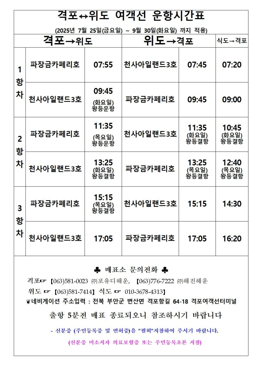 여객선 시간표(25.9.30까지) 작성시간25.07.25|조회수741 목록 댓글 0 글자크기 작게가 글자크기 크게가 다음검색 현재 게시글 추가 기능 열기 북마크 신고 센터로 신고 댓글 댓글 0 댓글쓰기 답글쓰기 댓글 리스트