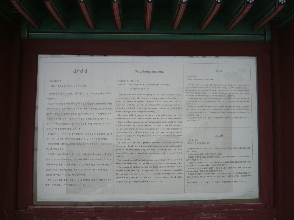 사적 제212호. 둘레 4,400m. 1716년(숙종 42) 전에 있던 것을 돌로 고쳐 쌓고, 그뒤 몇 차례에 걸쳐 중축·개축했다. 숙종 때 축성기록에 '인상당기지 개석축'(因上黨基址改石築)이라는 기사가 있는 점과 청주가 백제시대 상당현이었던 점으로 미루어 보아 이곳에는 원래 삼국시대부터 토성이 있었던 것으로 짐작된다. 이 산성은 상당산의 8부 능선에서 시작해 성내 골짜기를 감싸고 있는 동서 산맥의 등성이를 타고 사행(蛇行)하다가 남동의 수구를 향해 꺾여서 합쳐지고 있다.