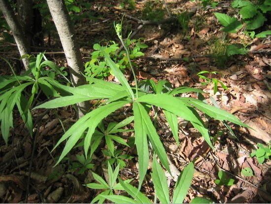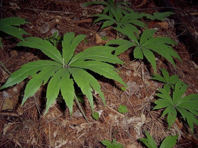 첫째 잎은 둥글고 7-9개 장상으로 깊게 갈라지며 지름 35-40(때로는 50정도)cm이고 열편은