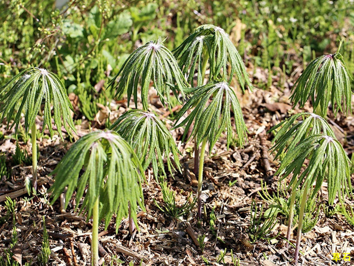 우산나물의 새순은 그대로 우산을 접어논 모습이고 ,우산을 펴는 형상으로 성장한다.