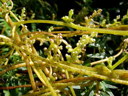 ( 위) 세력을 확장 중인 새삼덩굴- 콩과 식물에 기생한다.
