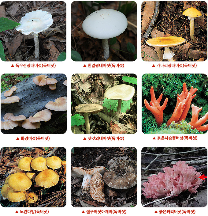 <노랑싸리버섯-독버섯> <붉은싸리버섯(광대버섯)-독버섯>