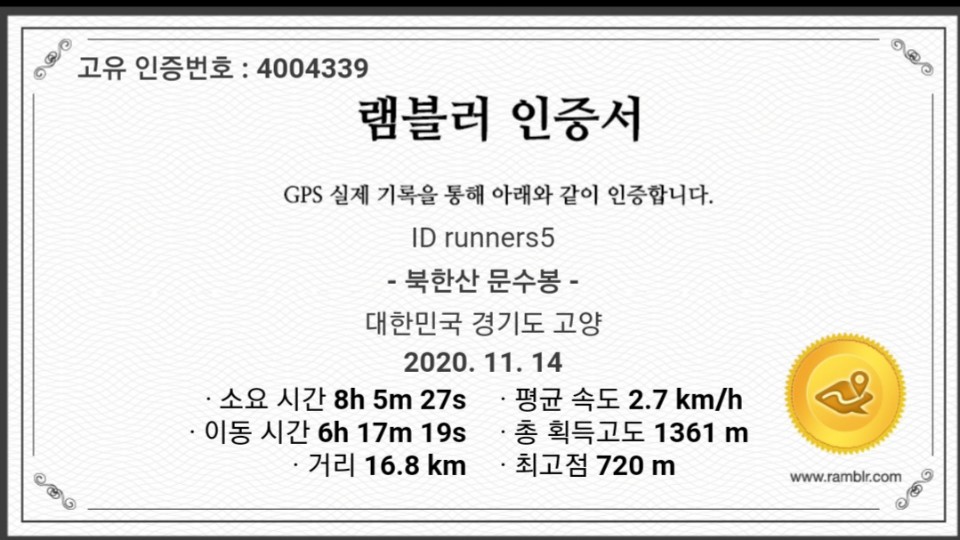 우리나라 5대명산인 북한산의 속살을 정확히 볼수 곳으로 종주 하믄 뿌듯한 마음을 갖고 인생의 추억으로 영원히 간직할 수 있는 곳이기도 하다. 북한산 종주코스로는 가장 긴 거리라 할 수 있었고 오늘을 계기로 3번째 탐방 느림의 철학을 동원하여 램블러 인증서를 받고 보니 새로운 기록을 만들었습니다.