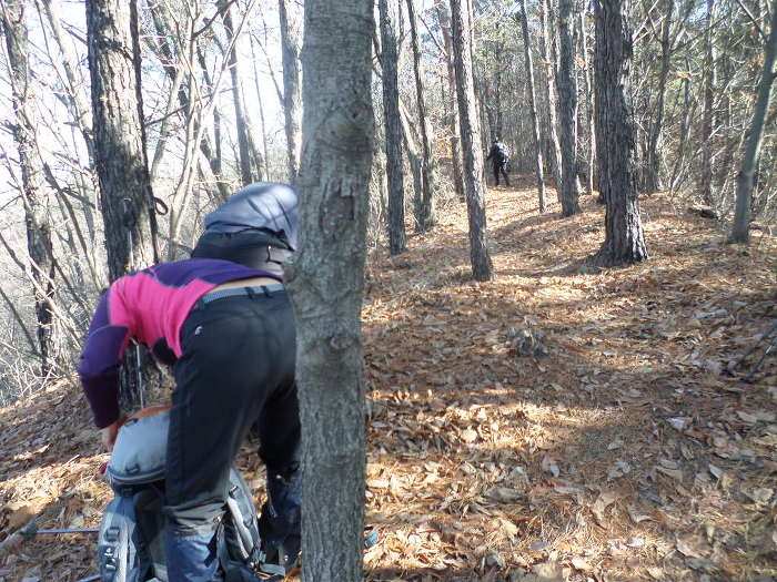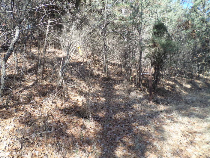 우측 낡은 표지기가 보이는 곳에 박대장이 새로 표지기를 걸어놓는다!~우측 잡목 숲으로~~