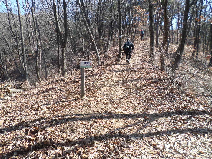 능선은 다시 사면길로 진행되다가 안부쪽으로 내려서게 되는데 오갑산 이진봉이 아직 3km 남았다는